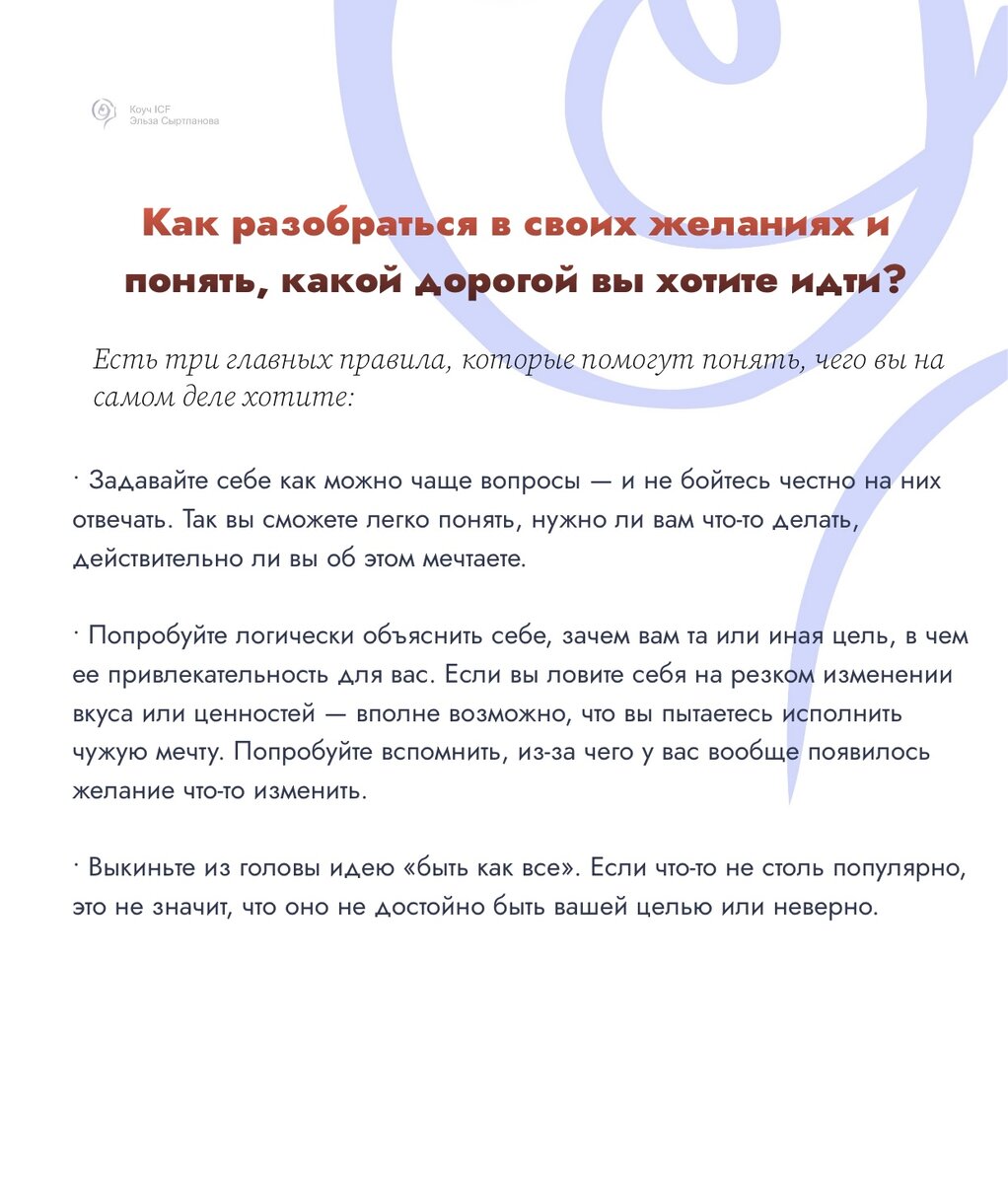 Иногда бывает очень непросто понять, чего именно вы хотите и о чем мечтаете... Порой мысли и мечты других людей могут казаться настолько привлекательными, что мы неосознанно принимаем их за свои. На нас каждый день влияют соцсети, реклама, окружающие, стереотипы и установки, мода. И мы просто не можем отличить собственное желание от мысли «Раз у всех есть, значит, и мне надо». Почему такое случается❓Если вам еще в детстве давали выбирать еду, что надеть в детский сад и какими игрушками играть, значит, скорее всего, вы выросли человеком, который умеет прислушиваться к своим желаниям. Однако, увы, чаще всего бывает не так. Чаще всего мамы и папы слишком заняты на работе и бытовыми делами, что просто не могут уделить внимание такой мелочи, как личный выбор ребенка. Если всю жизнь идти к навязанным вам обществом или другими людьми целям, то по итогу вы просто проживете чужую и не всегда счастливую жизнь. Впрочем, есть хорошие новости: вы можете научиться слушать себя и распознавать св