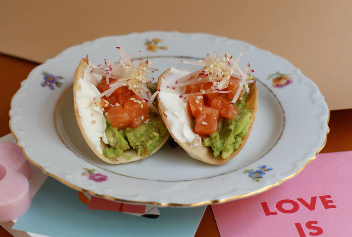- Хрустящие тако с авокадо, сливочным сыром и лососем в соусе понзу - 700 руб