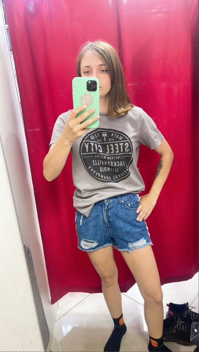 Всем приветики) Очень хочется показать вам мою покупку. Она очень крутая и интересная. Я в секонде примерила две вещи. Очень хотела себе шорты и футболки. Только подошла футболочка. Она просто шикарная. Я таких интересных и красивых еще не видела. Не думала, что за такие копейки найду такую модную вещь. Такой футболки точно ни у кого нет. Можете даже в этом не сомневаться. Она реально классно выглядит и интересно. Сначала покажу шортики, которые мне не подошли. Так хочу себе крутые шорты, но пока найти не удается. Во-первых, эти шорты очень большие. Мне такие точно не стоит носить. Вот шорты люблю по размеру. Не хочу, чтобы они на мне висели. Видите, как сильно они на мне висят. Точно такой вариант не стоит брать.. Куда мне их носить, если они огромные. Когда я опустила футболку, еще красиво выглядят шортики. Жаль, что размер большой. Теперь пришло время показать мою крутую футболку. Она просто шикарная. Хорошо, что я взяла успела её купить. Просто супер) Тут еще спереди непо