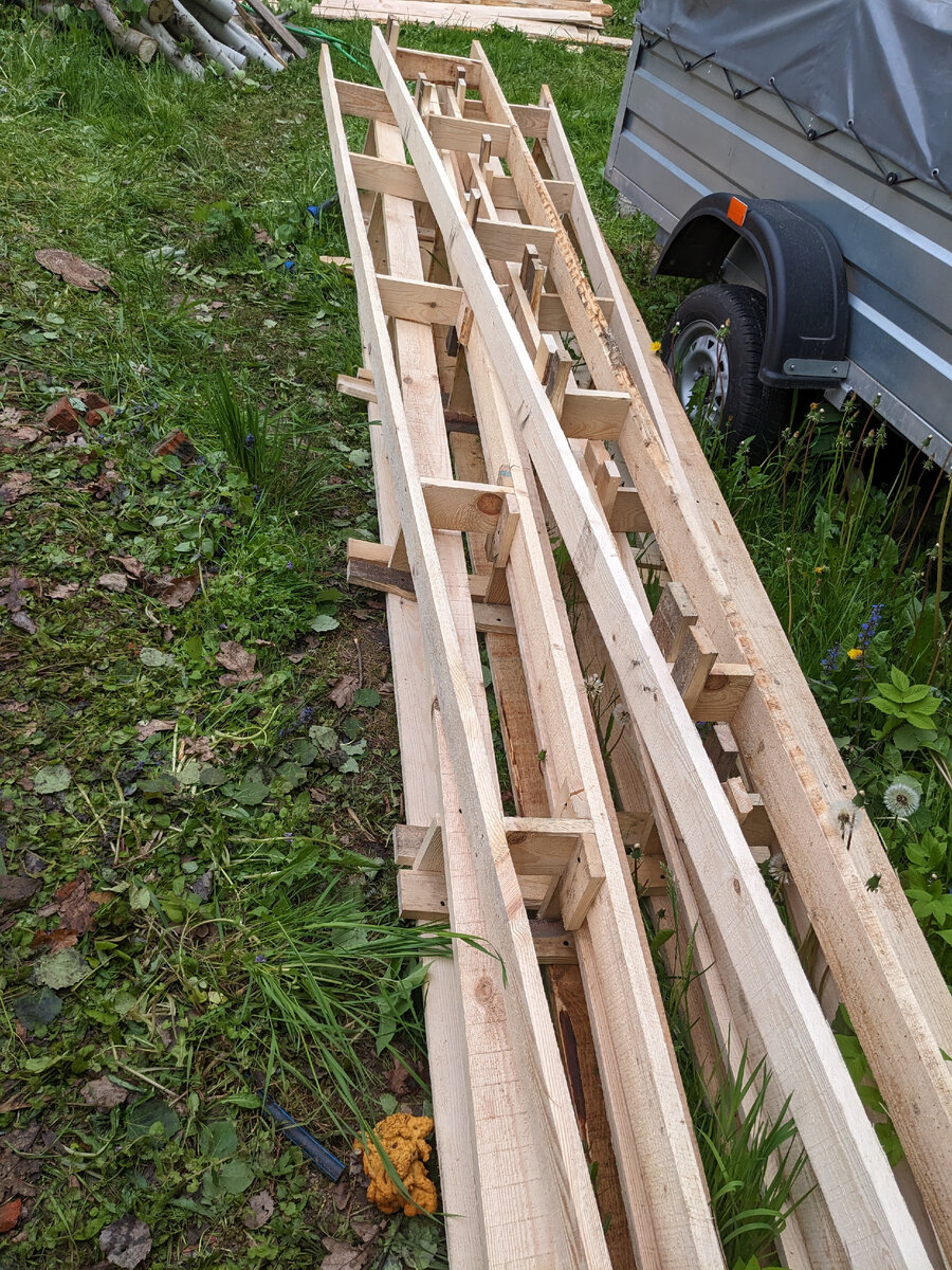 Поскольку стройка дома временно приостановлена, на участке образовался недострой в виде фундамента. Внутри - цокольный этаж, в котором временно расположена мастерская. От дождя я это все накрыл тентом, но тент протекает, потому что уклона нет, образовываются лужи, а когда вода стоит, рано или поздно она дырочку находит. Когда я решил разместить внутри лазерный станок, меня это стало напрягать. Да и вообще, хорошего мало, когда протечки. Решил не пожалеть времени и сделать нормальную крышу с уклоном, чтобы вода не стояла, а стекала. Заодно и утеплить, чтобы внутри конденсата не было зимой. Потом утеплитель пойдет на утепленнуб отмостку, а доска - на обрешётку крыши, так что по деньгам практически ничего не теряю, затраты только на тент, саморезы и штук десять досок пришлось измельчить, все остальное будет использоваться повторно уже в капитальном строении. Наделал заранее треугольников для стропил: Разложил утеплитель, сверху расставил стропила. Кстати, очень удобная штука - прицеп. В