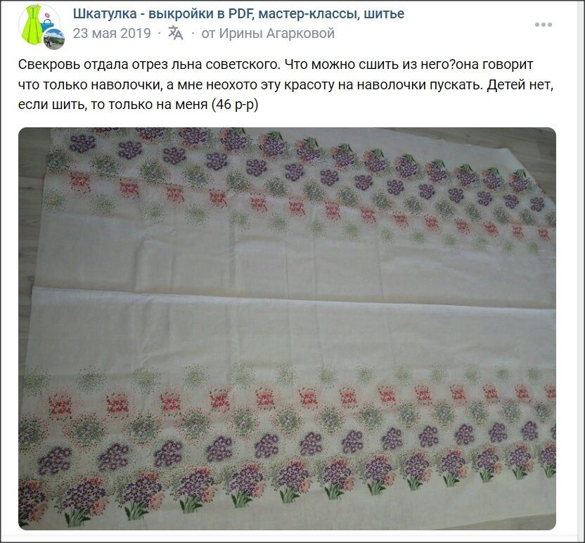 Казалось бы, если остались советские ткани, а может, кто подарил, что из них шить. Потому что они не похожи на современные. Впишутся ли в гардероб? А если не хочешь шить наволочки, простыни и скатерти, домашнюю одежду. Можно и на макеты пробники пустить. Знаю, есть охотники до советских тканей, есть среди них и интересные. Но как обладательница большого количества таких таких отрезов, скажу, что большая часть из них не самые ценные, не те, которые можно продать без проблем. Большинство из них - хлопчато-бумажные ситцы, есть и более тонкие - для домашней одежды. Каждый раз из поездки в Саратов привожу что-нибудь ещё, а часть тканей надо продавать, - очень их много. А некоторые таких расцветок и рисунков, что эта одежда в классику-классику не попадает. В комментариях к статьям некоторые предлагали жакеты в технике лоскутного шитья (совсем не мой стиль) или бохо, и опять домашняя одежда. Вопрос не такой простой как кажется. Хотела я найти в интернете материалы про качество сов