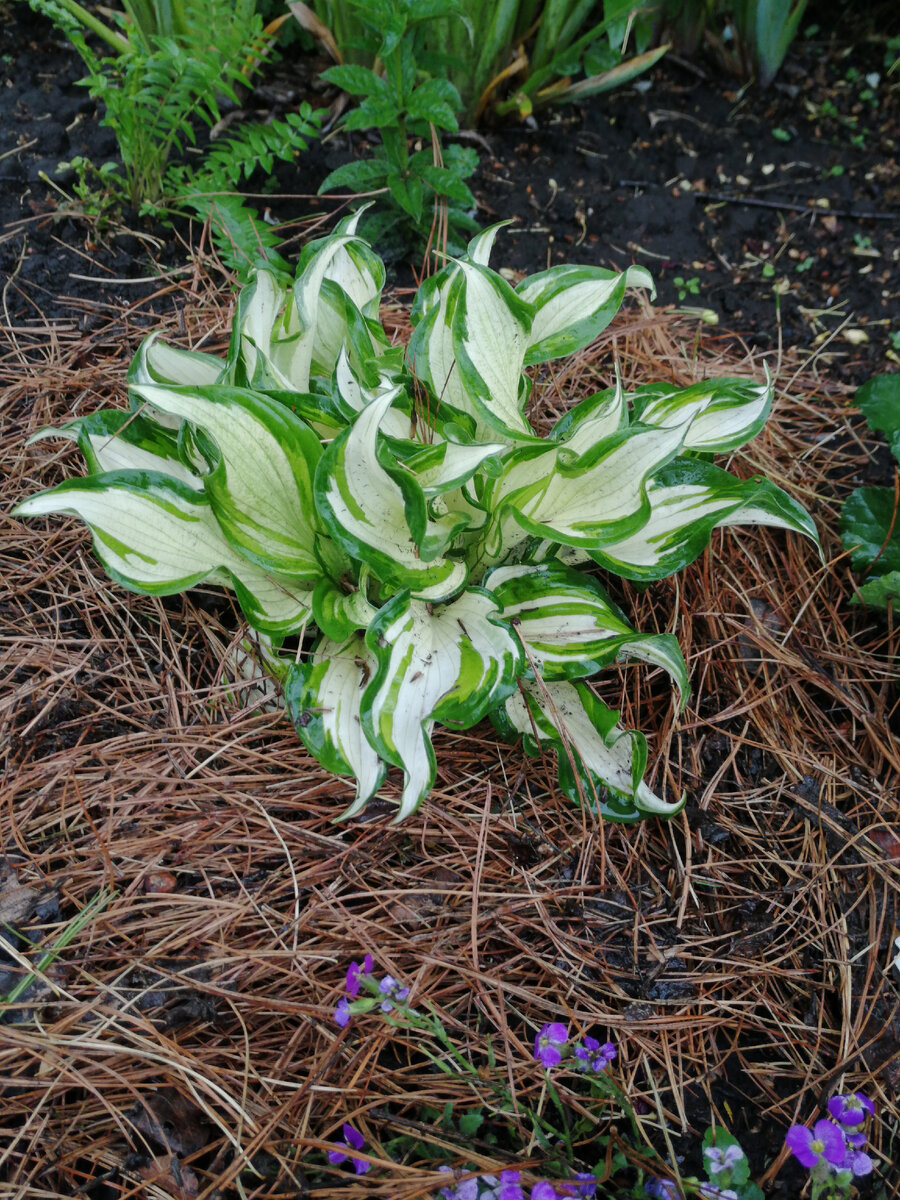 Нет, никаких шуток. После +38 у нас вчера было +14 и дождь. С ночи и до вечера. И это оказалось та-ак здорово... Пока возилась в саду, промочила две куртки, зато не спеша высадила всякую оставшуюся мелочь, повыдергала сорняки там, где увидела, выкопала часть тюльпанов, наконец подвязала валяющийся на земле клематис - неделю ни у кого руки не доходили. И поливать не надо! Счастье) Ну и главное - замульчировала хосты кедровой хвоей, пока до них слизни не добрались. Заодно провела небольшую ревизию. Не так давно читала статью о том, что хосты, купленные в магазине корнем с одной (как правило) почкой активно прирастать начинают не раньше, чем на третий год. Вот и поглядим, соответствуют ли мои хосты "стандартам" - большинству как раз пошел третий год. Хоста волнистая 'Медиовариегата' Не монстр, конечно, но уже и не кроха. К середине сезона листва такой контрастной не будет, ну да мне здесь акцент и нужен скорее в начале лета, дальше уже не так важно. Хоста 'So Sweet' таки, похоже, не пер