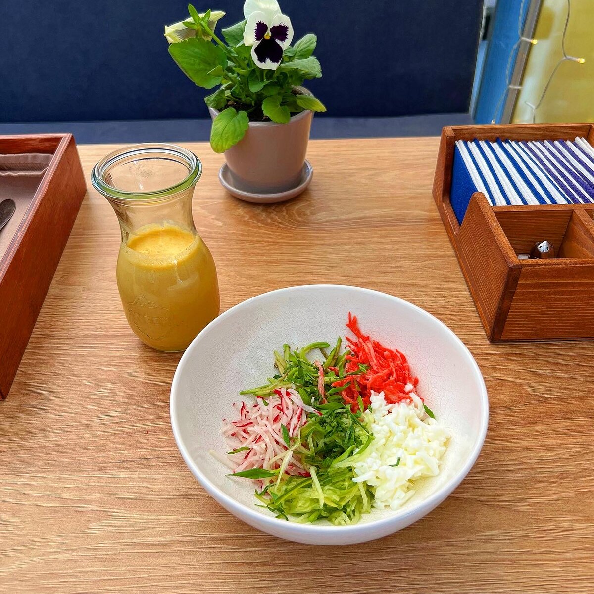 Окрошка Том Ям из летнего меню гастробара «8/35» по 435 ₽ (в будни с дневной скидкой 15% — 369,75 ₽). В составе: паста том ям, сливки, снежный краб (крабовые палочки) с икрой тобико, редис, огурец, авокадо, белок варёного яйца, зелёный лук. Подают окрошку в стиле «сделай сам»: плошка с лежащей по отдельности начинкой и сосуд с заливкой. В тарелке всё, за исключением яичного белка, порезано очень тонкой соломкой. Что в итоге? Получается суп с приятной остринкой. На том ям похоже только при изрядной доле фантазии. В целом суп недурен. Прохладный, приятный на вкус и, как ни странно, все ингридиенты между собой сочетаются. Даже такая нарезка, которая в обычной окрошке этого заведения превращает содержимое в месиво, которое к тому же не очень удобно есть ложкой, здесь вполне уместно. Да, и икры хоть совсем немного, но определенную хрусткость она даёт. Оценка 8 из 10. Не скажу, насколько это в стиле том ям и не является ли «том ям» просто продающим названием, но паназиатская но