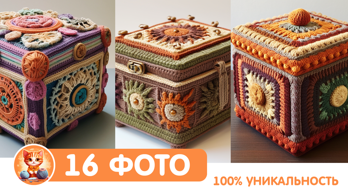 Замечательные идеи для оформления шкатулок, коробок, корзинок предложила нейросеть. Вязаные крючком мотивы, сочетание пряжи разного цвета - 16 уникальных идей на ваш выбор. В ход пойдут даже остатки. Меня порой удивляет анализ нейросети. Ей предложили сгенерировать коробку, связанную крючком. Коробка всегда квадратная. И вот искусственный интеллект начинает подбирать варианты как можно обвязать коробки разного размера, с прямыми углами. Решение потрясающее - использовать квадратные мотивы! Сами мотивы можно вязать из ниток разного цвета. Даже маленькие остатки можно использовать с пользой. Соединять мотивы можно любым способом подгоняя по высоте и ширине сторон коробки-заготовки. В общем, рукодельницы, берите себе на заметку. Очень красиво и рационально. Коробка для вязания крючком землистых цветов Если захотите попробовать сгенерировать свои идеи для вязания, можете использовать описание: artistic crochet box earthy colors. Это описание подходит для любой нейросети, но в разной степе