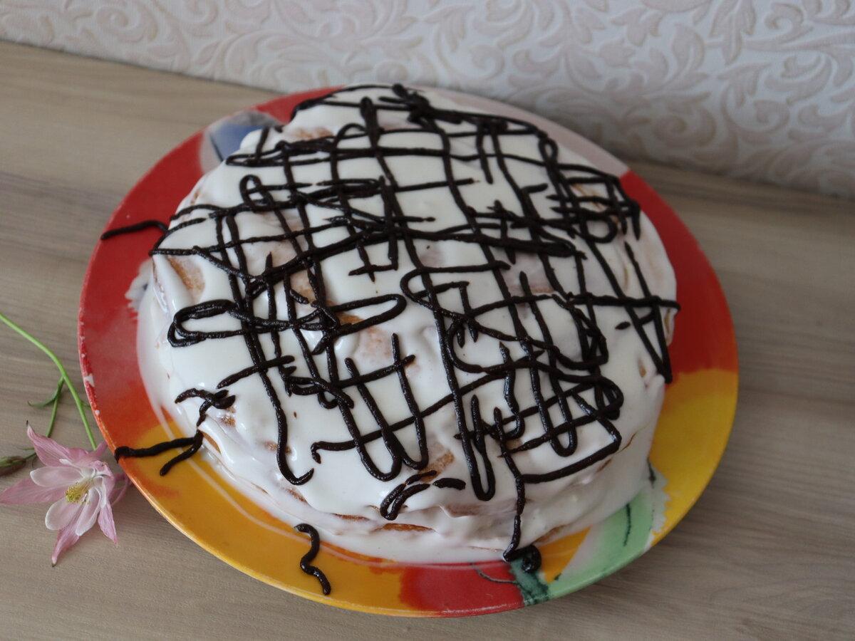 Заготовки можно ещё разрезать вдоль на два коржа каждую, обмазать кремом, выкладывать на плоское блюдо. Таким образом сделать несколько слоев.