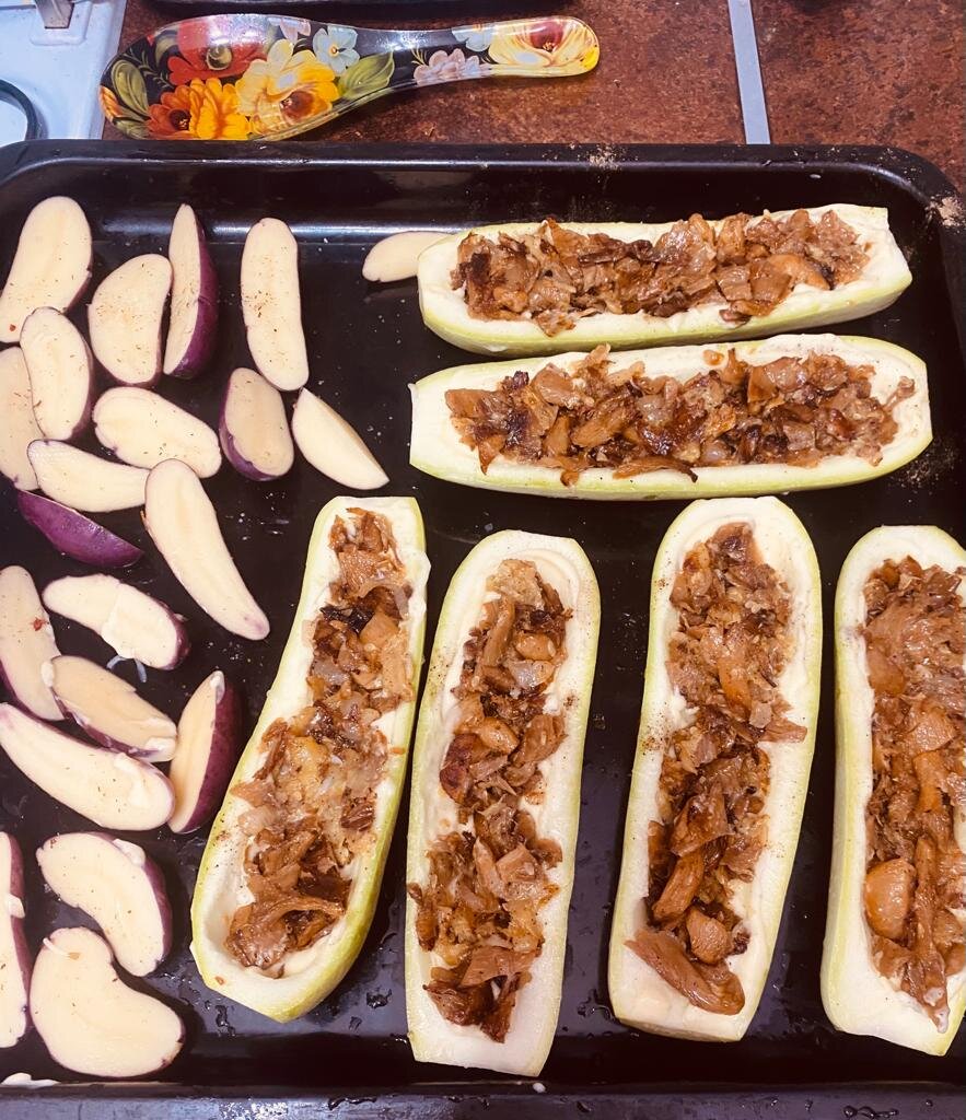 Чтобы не стоять у плиты и жарить кабачки, лучше их запечь в духовке. Я люблю жареные кабачки, но если нет времени, давайте быстро запечем в духовке. Приготовление: 4 . Рядом выкладываю молодой картофель, посоленный и обсыпанный прованскими травами. Картофель можно и не выкладывать. Я выкладываю потому-что, не хочется чтобы пропадало свободное место, а потом, запеченная картошка, получается очень вкусной. Молодую картошку запекаю с кожурой, просто хорошо промываю. 5. Сверху, на начинку, выкладываю нарезанный дольками помидор и сверху посыпаю натертым сыром. Сыр не должен просыпаться на противень, будет гореть. Теперь готовые кабачки и картошку убираю, а противень застилаю пергаментом. Бумагу сверху промазываю маслом и выкладываю кабачки и картошку. Это можно сделать и сразу. 6. Духовка уже прогрета до 220 градусов. Ставлю кабачки в духовку на 40-45 минут. 7. Все запеклось, картошка тает во рту. Кабачки получаются нежными и сочными. Продукты: 3 кабачка; 150г грибов свежих или зам