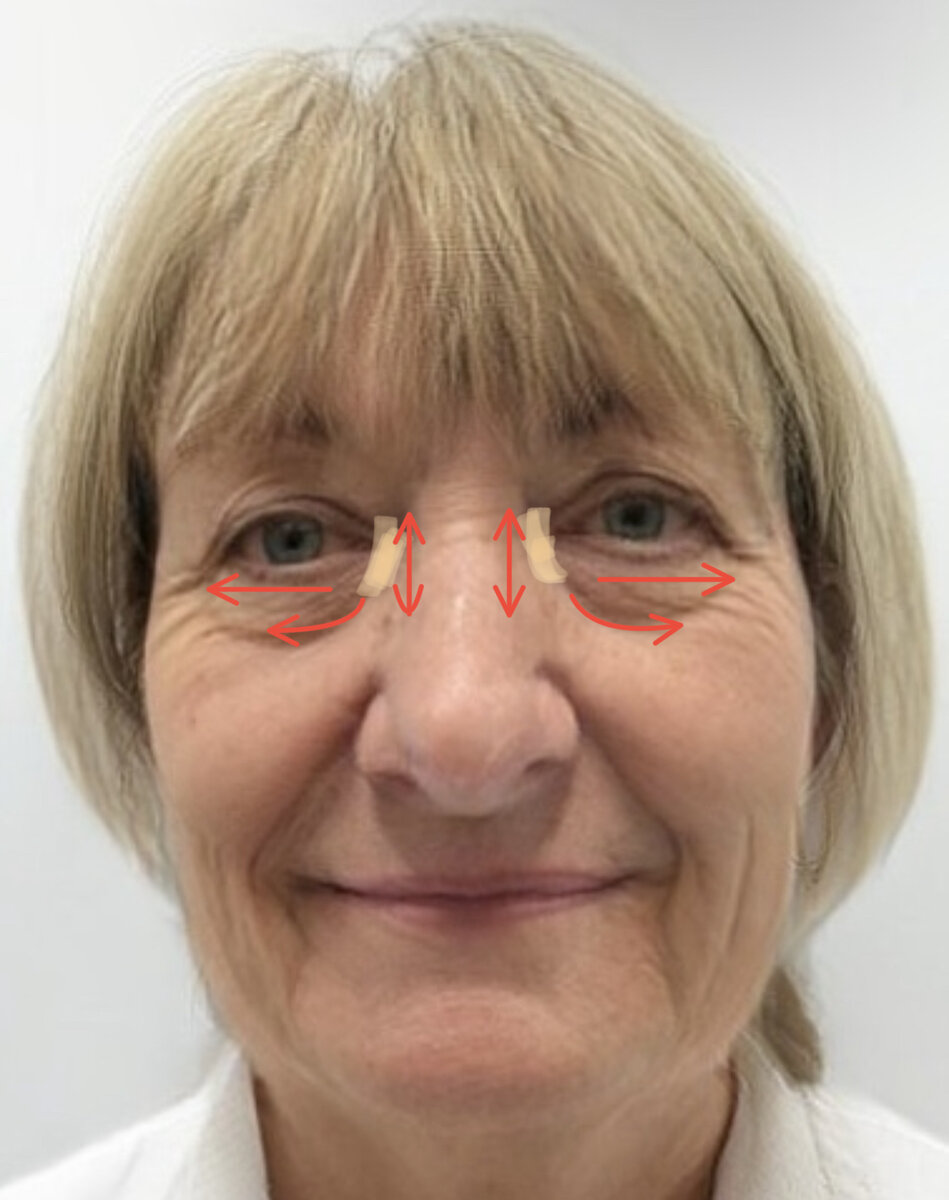 Продукт как раз-таки не нужно наносить на сами заломы - только в уголки глаз и когда вы хорошенько вбили средство в данной зоне, только лишь остатками на кисти можно пройтись под глазами параллельно морщинкам.