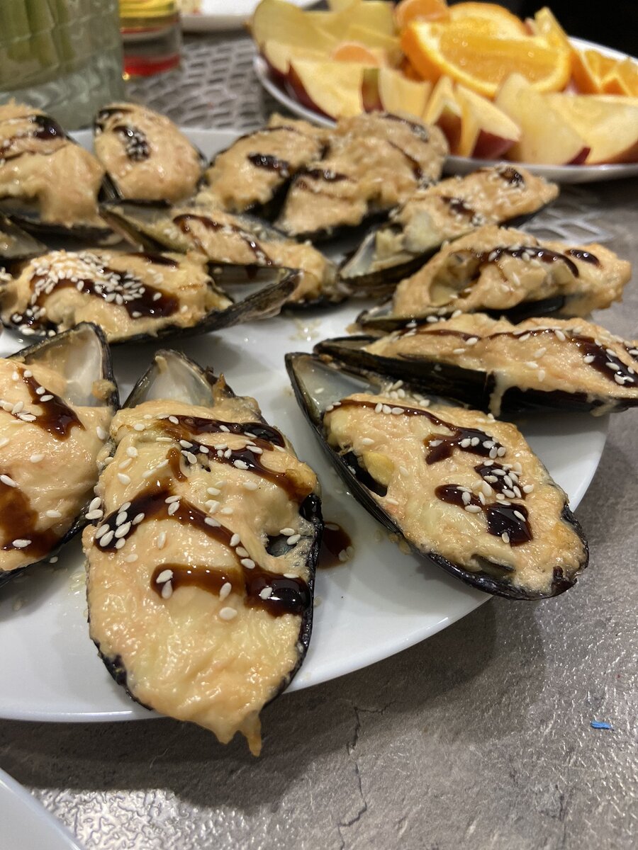 Добрый день, дорогие друзья! Сегодня хочу поделиться с Вами невероятно вкусным способом приготовления гигантских мидий на полустворке. Блюдо получается не только вкусным и необычным, но и очень эффектным. Вы и ваши гости обязательно восхититесь им 😍!!! Ингредиенты: Мидии гигантские (30-40) Киви -1 кг Икры мойвы копчёная - 1 банка Сыр ( гауда, голландский) - 100 гр. Майонез -100 гр. Чеснок -3-4 зубчика Соус унаги, кунжут для подачи и украшения! Приготовление: 1. Итак, для начала нужно разморозить мидии при комнатной температуре. Затем необходимо отделить мясо мидий от ракушки. Ножку,которая у Вас остаётся на ракушке необходимо аккуратно отделить чайной ложкой. Нож при этой процедуре использовать не рекомендую,т.к. можете повредить раковину и будут сколы,а она нам ещё понадобится. Мясо мидий для удобства я всегда разрезаю на три части. Так удобнее будет кушать. 2. Делаем нашу "шапочку": Сыр трем на тёрке, добавляем икру мойвы,майонез и чеснок, пропущенный через чеснокодавку. Перемешив