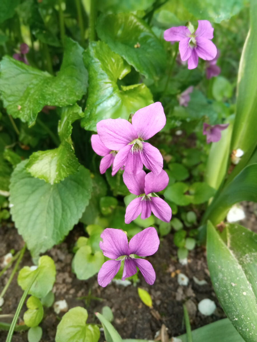 Мне нравятся фиалки, давно хотела поселить их в саду, но как-то не получалось. В позапрошлом году собрала семена с очень низкорослой фиалки, растущей недалеко от дома в Москве и посеяла в плошку на даче. Но ничего не взошло. Может быть, слишком рано семена взяла, они не успели полностью созреть. В прошлом году купила наконец довольно крупную фиалку, но название сразу не записала, а потом забыла. В высоту около 30 см, довольно большой кустик. В этом году она зацвела. Цветки среднего размера, странноватого цвета - лилово-малиновые. Их немного, они выглядывают из-под листьев. В целом, цветение меня не впечатлило, хотя цветки, конечно, красивые. Не успела она отцвести, как я обратила внимание на то, что вокруг неё много одинаковых всходов. Явно что-то насеялось. И скорее всего, что-то культурное, сорняки всё-таки не так кучно всходят. На фиалку я не подумала, потому что в прошлом году она не цвела. Время шло, у сеянцев выросли настоящие листочки, которые напоминали фиалковые. У меня по