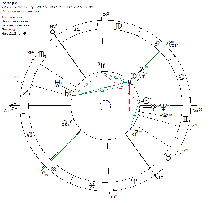 Отметим также расположенную на Вертексе Луну — Светило «включает» его Миссию, делает ее реализацию личностно-значимой, влияя и на сам стиль изложения. «Ремарк поделился с Боймером рядом особенностей своей натуры, своего психического склада» - пишет Бергельсон о главном герое «Западного Фронта».