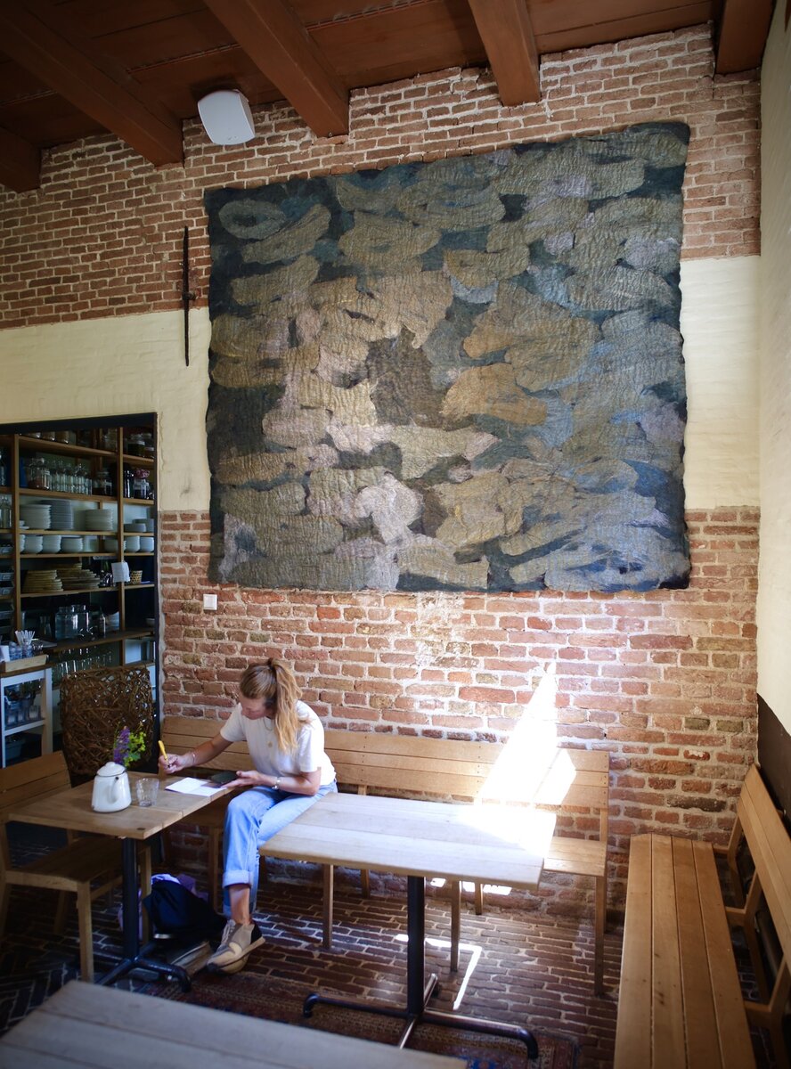 Однажды гуляли с мужем в Роттердаме и зашли в кафе. Кафе как кафе, таких в Нидерландах тысячи, но что сразу бросилось в глаза-стена украшенная огромным ковром. Ковер был свалян из войлока. Так я и узнала о голландской королеве валяния Клауди Йонгстре. Клауди по профессии художник-модельер. Однажды она увидел монгольскую юрту и влюбилась в войлок. Быстро освоив технику валяния, она начала создавать ковры, комбинируя шерсть, шелк и прозрачную органзу. Очень быстро творения молодого модельера оценили как образец элегантности. Для получения войлока высочайшего качества, Клауди разводит овец древнейшей в Европе породы Дренте Хит. Сегодня в мире насчитывается чуть больше тысячи таких овец. Шерсть она обрабатывает сама по оригинальной методике и окрашивает растительным сырьем, которое тоже выращивает сама. Клауди Йонгстра разрабатывала и выпускала ткани для таких именитых Домов мод, как Джон Гальяно, Донна Каран, Кристиан Лакруа, а одной из её первых работ была работа над костюмами джеда