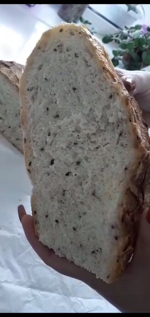Ингридиенты: Мука - 600 гр, Вода 350 мл, Дрожжи сухие - 3 гр, Соль - 10 гр, Сахар - 3 гр, Масло оливковое - 20 мл, Семена льна - по желанию. Опара: Смешиваем воду, дрожжи, сахар, 100 гр. муки и оставляем в тёплом месте на 30 мин. Тесто: добавляем все оставшиеся ингридиенты, замешиваем мягкое тесто и убираем на расстойку в теплое место. Каждые 1,5 часа делаем обминку. После каждой обминки тесто становится пышней и воздушней. После третьей-четвертой обминки придаём тесту желаемую форму, Закладываем тесто в чашку на пергамент и даём расстояться еще 60-90 мин. Раскаляем духовку до 220 градусов. В духовке нагреваем форму, в которой будем печь хлеб. Переносим в горячую форму хлеб на пергаменте. На дно (под пергамент) кладём 2-3 кусочка льда или 30-40 мл. воды и сразу накрываем крышкой и убираем в духовку. Отпекаем 50 мин. при температуре 220 градусов: 25 минут под крышкой и 25 минут без крышки до золотистой корочки. Приятного аппетита! Если у Вас остались вопросы - пишите в комментариях