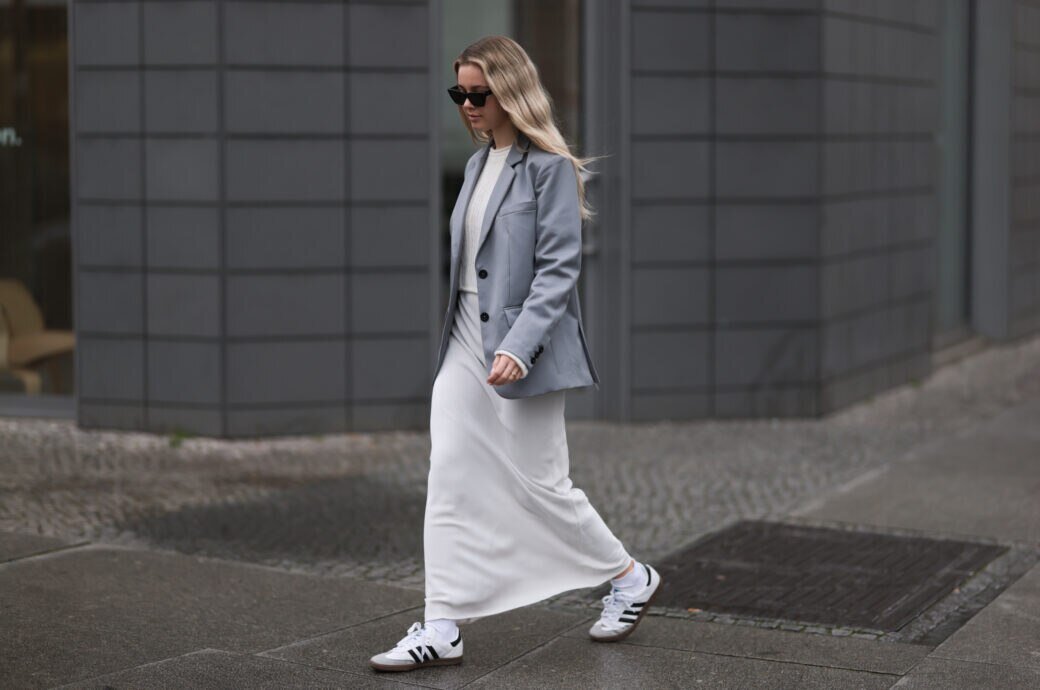 - С платьем или юбкой. Это сочетание выглядит игриво, женственно и неожиданно. Выбирайте кроссовки, которые контрастируют с платьем или юбкой по цвету или фактуре. Например, к легкому платью из шифона или атласа подойдут белые кеды или кроссовки на платформе, а к юбке из денима или кожи — яркие или цветные кроссовки на массивной подошве или «папины кроссовки». Дополните образ бомбером, джинсовой или кожаной курткой.