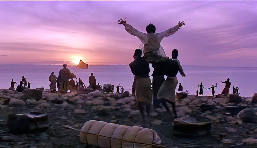 Большой караван работорговца, что проходит мимо, спасает их от неминуемой смерти и приводит в маленький и пыльный город Казех.