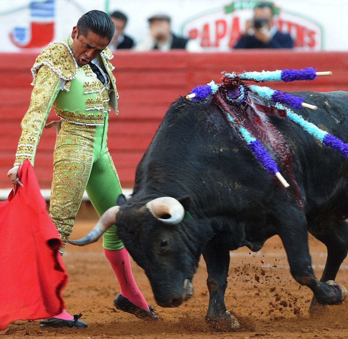было вот буквально перед лицом. Фиг их знает, травмы эти детские, о чем нам психологи "вдувают" в уши и почти психологи тоже... Очевидных травм я не припоминаю, а вот тогда я получила такую травму, что БУДЬ ЗДОРОВ... я как только увидела, что бык выскочил на арену УЖЕ В КРОВИ, я испытала боль, дикую, страшную, бессильную боль от ужаса и несправедливости. Это же просто жестокость. И больше ничего. Я была как в кошмаре, вокруг все апплодтровпли, орали и скандировали что -то... Видимо имя тореадора.. А он " Травил " бедное обреченное животное... Бык хрипел, злился, рыл землю копытом... Но он был абсолютно обречен. У него была пробита основная артерия. Он этого не понимал, но ведь это понимали ВСЕ МЫ. каждый "человек " на трибунах это понимал. И я орала , я плакала, и лицом в колени себе упёрлась и просто выла, настолько я поняла, что этой дикости не должно быть в жизни. Я дура, ДУРА, ЧТО стеснялась встать и уйти, я не хотела, чтоб на меня смотрели эти люди. Я закрылась в свой ужас и тв