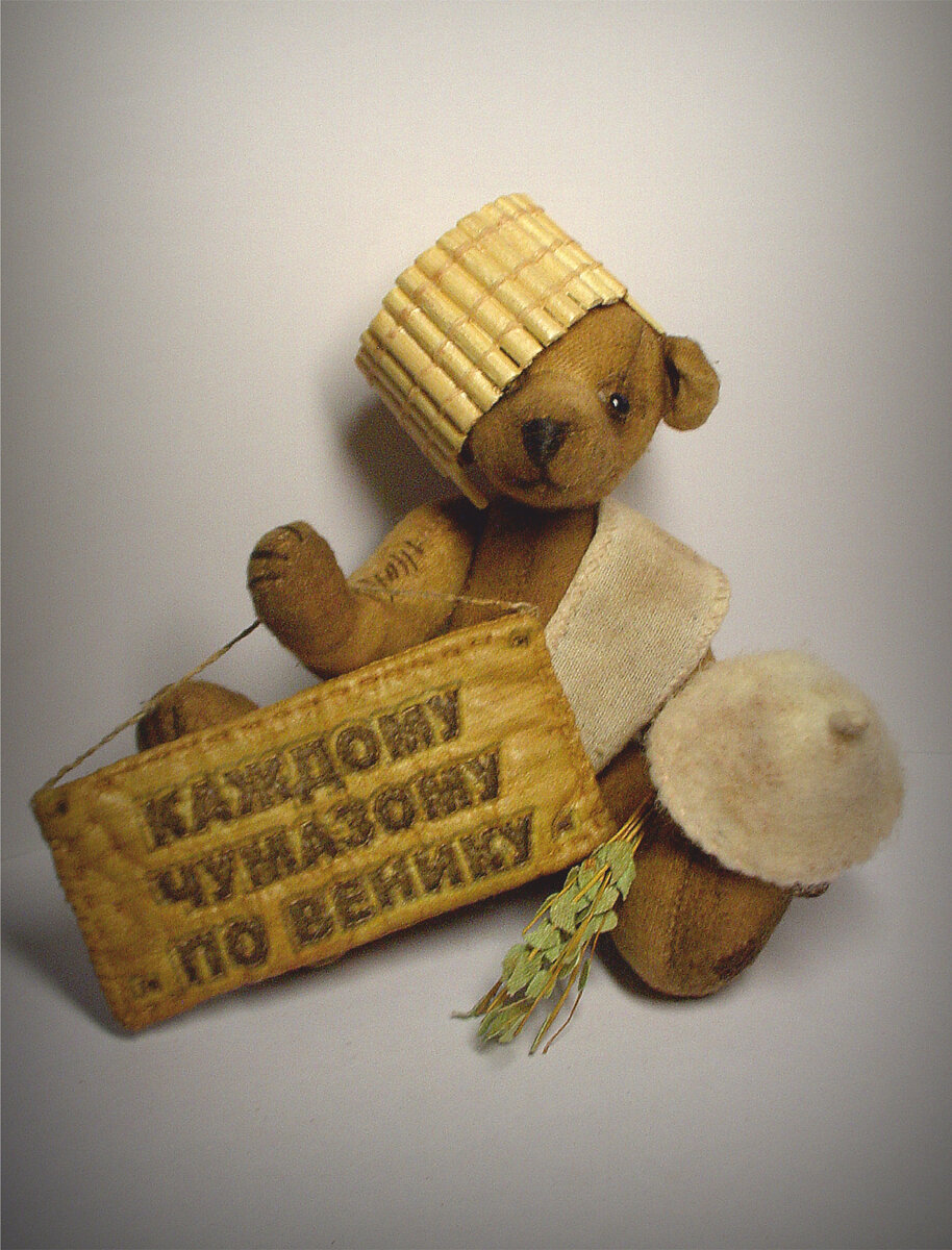 Дерновая Мария Каждому чумазому по венику! Размер 15 см. Материалы: Мишка сшит из хлопка, окрашен кофе и корицей, тонирован маслом. Глазки из самоотвердевающего пластика окрашены акрилом и лаком, голова на шплинте. Табличка сшита из ткани, нанесена аппликация текста, простегана вручную, покрашена чаем. Полки, веник, полотенце, черпак, шайка тоже самодельные: картон, пенопласт, щепки от китайских палочек, ткань. Шапочка сваляна из шерсти. Банька – коробка, внутренние стенки которой декупажированы, внешние - состарены акрилом. Мишка "Рич-жонглер» Рост: 25 см без колпака. Материалы: старинный плюш, иск. замша, шерсть ламы, бархат, сетка, синтепон. Нос - вышит нитками и покрыт воском, глаза - бусины ручной окраски, тонировка худ. маслом, нитяное крепление лап, голова на шплинте. Наполнитель - синтепон и минеральный гранулят. Вышивка люрексом и бисером. Аксессуары: текстильные и валяные шарики на проволочке. Попрыгунья Стрекоза Рост около 20 см. Материалы: х/б ткань окрашена акрилом, теня