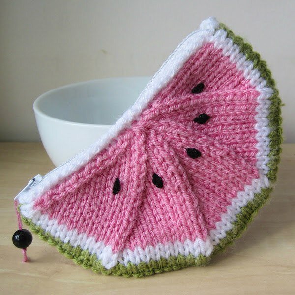 Хотите, чтобы лето было с вами даже в холодную погоду? Свяжите для себя косметичку в форме дольки сочного арбуза. Для нее не надо специально покупать пряжу — используйте остатки, наверняка у вас их немало. Размеры: 16,5 см в ширину и 10 см в глубину. Материалы Остатки пряжи розового, белого, зеленого и черного цветов. Спицы № 5,5. Плотность вязания 15 петель x 21 рядов 10 смx 10 см Наберите 6 петель розовой нитью и вяжите ряды с 1-го по 16-й розовым. Ряд 1:изнаночными (6 петель, изнанка) Ряд 2: [вяжем 2 петли с одной, в следующем ряду перекручиваем петлю, чтоб не было дырочки] x 5, 1 лицевая (11 петель ) Ряд 3:изнаночными (11 петель ) Ряд 4: [1 лицевая, вяжем 2 петли с одной, в следующем ряду перекручиваем петлю, чтоб не было дырочки] x 5, 1 лицевая (16 петель ) Ряд 5:изнаночными (16 петель ) Ряд 6: [2 лицевые, вяжем 2 петли с одной, в следующем ряду перекручиваем петлю, чтоб не было дырочки] x 5, 1 лицевая (21 петля) Ряд 7: изнаночными (21 петля) Ряд 8: [3 лице