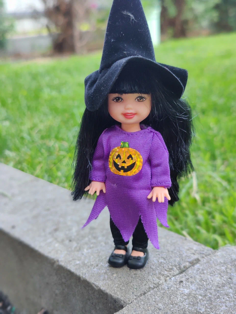 Итак, еще одна куколка из набора Halloween Fun Li'l friends of Kelly - ведьмочка Дженни. Вместе с Дженни с комплекте с ней идут картонные метла и сумка для конфет. Фото из интернета: Шляпка Дженни пришита к голове, внутри кусочек бумаги, чтобы шляпка сохраняла объем. Под шляпкой обнаруживается копна волос, но длина волос очень не равномерная. Если не планируете играть с куколкой, то лучше оставить в первозданном виде, но волосики очень мягкие. Девочка одета в фиолетовую трикотажную тунику с термонаклейкой в виде тыковки. Сзади на липучке. Внутри и по низу ткань не обработана. Под туникой черные трикотажные гамаши на резиночке. Сзади, как на классическим колготках на попе полоски. Обута в черные сандалики. При снятии которых у одной сандали лопнул ремешок. Так что очень аккуратно с аутфитом старых кукол. Молд головы и тела, как и у всех пупсиков в сете - 1994 год, Mattel. Как я уже писала в прошлой статье, малышка живет в семье индейца Кэма. Вот такая милая маленькая ведьмочка. Про дру