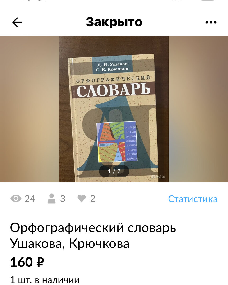 Всем доброго времени суток! Отчитываюсь о продажах первой недели июня. Продала орфографический словарь , купили при личной встрече, нам уже не нужен, пользовались в начальных классах, и к тому и есть большой словарь Ожегова .