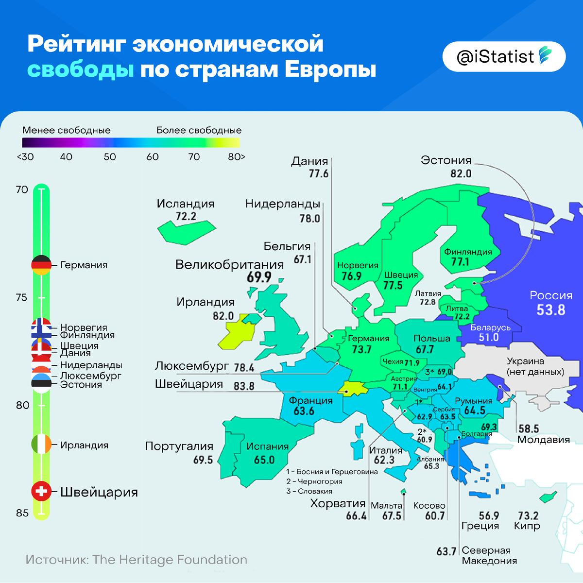 Экономическая свобода - мощный инструмент оценки благосостояния стран, но как выглядит ее распределение по миру в 2023 году? Индекс экономической свободы от Heritage Foundation ранжирует все страны мира по шкале от 0 до 100. Страны с оценкой 80 и выше считаются свободными экономиками, 70-79.9 - в основном свободными, 60-69.9 - умеренно свободными, 50-59.9 - в основном несвободными, и 0-49.9 - угнетенными. Что учитывается при определении индекса? Это четыре общие категории с тремя ключевыми показателями в каждой, как качественными, так и количественными: 1) верховенство закона: права собственности, эффективность суда, целостность правительства; 2) размер правительства: налоговые нагрузки, фискальное здоровье, государственные расходы; 3) регуляторная эффективность: свобода труда, денежная свобода, свобода предпринимательства; 4) открытые рынки: финансовая свобода, свобода торговли, свобода инвестиций. Возможно, вы удивитесь, но Сингапур возглавил список стран с наивысшей экономической