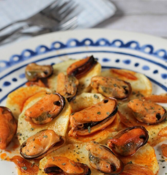 3. Наливаем литр горячей воды, кладем картофель и половину петрушки, солим варим под крышкой 8 минут. Добавляем в сотейник мидии, доводим до кипения, убавляем огонь и готовим 10 минут.