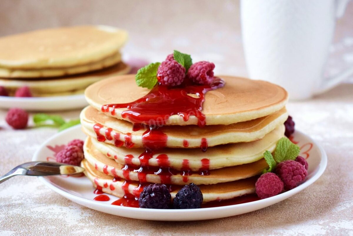 В отдельную ёмкость просеиваем муку (200 г) и разрыхлитель (1 ч. ложка). Если вы хотите добавить в тесто корицу или другие сухие специи, сыпьте их сейчас, лучше тоже просеивать их. Очень тщательно всё перемешиваем, я рекомендую делать это венчиком, так результат будет лучше. Важно, чтобы разрыхлитель равномерно смешался с мукой, иначе может оказаться, что в какой-то части теста его нет вообще, и тогда оно не поднимется, а где-то наоборот разрыхлителя окажется очень много и вы можете ощущать вкус соды. Так что не ленитесь всё хорошенько перемешать. Добавляем просеянные муку с разрыхлителем в ёмкость с тестом. Перемешиваем до однородности, но стараемся работать быстрее, если долго вымешивать тесто, в муке начнёт развиваться клейковина и панкейки могут получиться не мягкие, а «резиновые». Всё, тесто готово, оно получается не очень густое и довольно хорошо течёт. Жарить панкейки следует сразу, а не оставлять на потом (если уж быть совсем точными, блинчики обычно не жарят, а пекут).Печь будем на сухой сковороде без масла, именно благодаря этому блинчики получаются такие равномерно румяные и гладкие. Также для получения такого однородного цвета, важно использовать сковороду с гладким дном, без рельефов. Хорошо подходит сковорода с гладким антипригарным покрытием. Диаметр сковороды может быть любой, но от этого зависит сколько блинчиков за раз вы сможете пожарить, поэтому я предпочитаю брать самую большую.Сковороду ставим на средний огонь и хорошо разогреваем. Наливаем тесто на горячую сковороду. Лейте тесто в середину блинчика, оно будет само растекаться. Если будет нужно, немного подравняйте, чтобы круги получились максимально ровные. Я делаю их диаметром примерно 7-8 см, но этот размер не обязательный, делайте, как вам нравится. Блинчики пекутся довольно быстро, поэтому я рекомендую наливать тесто для одного панкейка за один раз, лучше возьмите большую ложку или половник, зачерпните побольше теста, налейте сразу столько, сколько нужно на один блинчик, лишнее верните обратно в ёмкость с тестом. Если же будете наливать небольшими порциями несколько раз, блинчик может неравномерно пропечься и получится неоднородно румяный.Когда на поверхности налитого теста начнут появляться пузыри, пора переворачивать наш панкейк. Если вы выбрали правильный температурный режим, то к тому моменту, как появятся пузыри, блинчик должен быть уже не совсем жидким сверху (иначе, при переворачивании тесто немного растечётся, блинчики получатся кривые), а снизу равномерно подрумяниться. Если снизу панкейк уже начинает подгорать, а сверху ещё совсем жидкий — снижайте огонь на плите. Ну и соответственно наоборот, если он уже весь пропёкся, а снизу совсем светлый, нагрев следует увеличить.Жарим панкейки с обратной стороны до такого же румяного цвета, как и с первой стороны.Чтобы проверить, хорошо ли пропекаются у вас панкейки, разломите один и посмотрите, не осталось ли внутри сырого теста. На разломе должно быть видно, что блинчик пропёкся и равномерно поднялся.Панкейки готовы, не ждите, пока они остынут, ешьте их сразу. К ним хорошо добавлять ягоды, орехи, поливать различными сиропами и сладкими соусами, растопленным шоколадом, сгущённым молоком или мёдом.