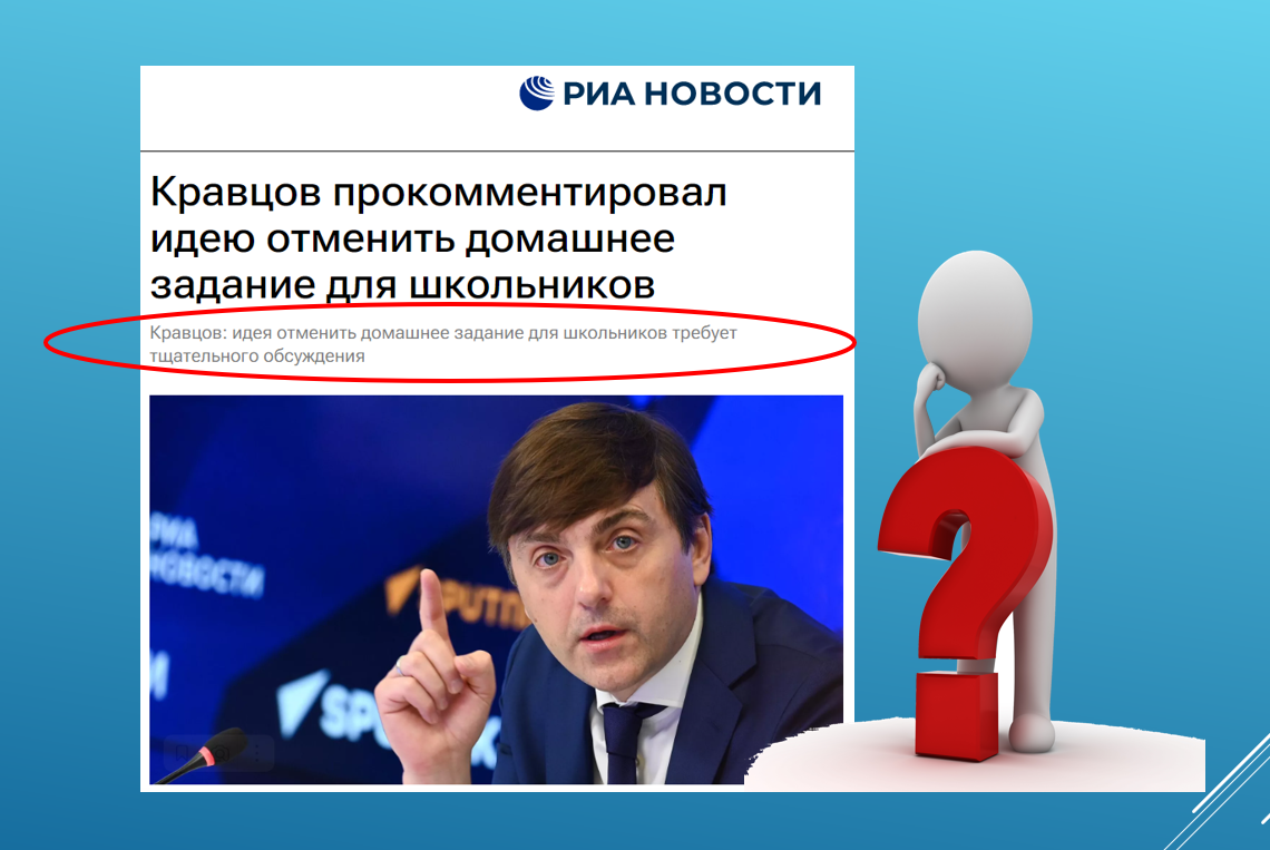 На днях опубликовала небольшое размышление по поводу отмены домашних заданий. Могу понять депутата, заявившего во всеуслышание, что «время пришло» освободить школьников от «домашки». Парламентарий, как сказали бы пару лет назад, «хайпанул»: тема резонансная, дискуссионная, на ней легко повысить собственную узнаваемость. Заявление господина заседателя было настолько громким, что его услышало не только учительско-родительское сообщество, но и сам министр образования! А наш министр умеет удивлять! Не разочаровал и в этот раз: удивил! Высказался кратко и ёмко: «Требует очень тщательного обсуждения». И всё! Вот так! Вопрос требует обсуждения! Что могу сказать? Только одно: хайпануть хотят все, даже министры. Обычный учитель такую фразу даже не додумается произнести. Для него очевидно: нельзя отменять домашние задания (конечно, если речь не идет о школе «полного дня» или о предметах вроде физической культуры, не выносимых на проверки-аттестации). Хотя и некоторые физруки умудряются-таки дава