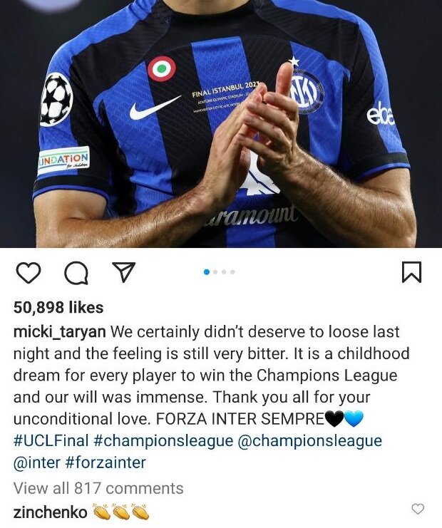 Он провел на поле всего 10 минут. «Интер» драматично проиграл «Манчестер Сити» в финале Лиги чемпионов – пропустив лишь один мяч и не реализовав собственные моменты. После игры армянский полузащитник Генрих Мхитарян выложил пост в соцсетях: «Мы определенно не заслужили поражения этой ночью, чувство до сих пор очень горькое. Каждый игрок мечтает выиграть Лигу чемпионов с детства, наша воля была огромной. Спасибо всем за вашу безусловную любовь». Под постом Мхитаряна оставил сообщение из эмодзи игрок «Арсенала» Александр Зинченко. Генрих Мхитарян вышел на замену в конце матча, став первым в истории армянским футболистом, сыгравшим в финале ЛЧ.