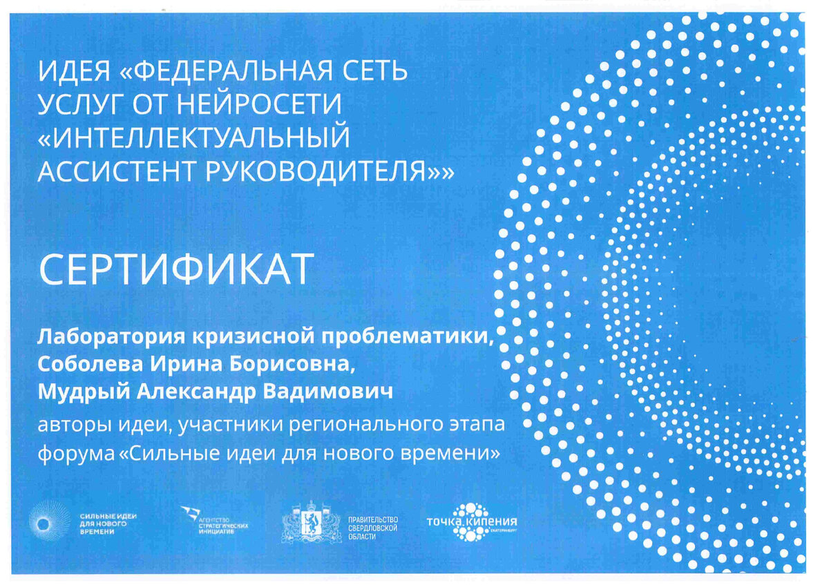 Также, наша Нейросеть сама себя продвигает и по её рекомендации, мы подали заявку на участие в Правительственном Форуме "Сильные Идеи для Нового Времени", проведение которого организует "Агентство Стратегических Инициатив".