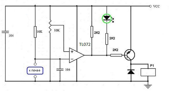 Нередко в продаже можно встретить такие приспособления, которые устанавливаются на цветочный горшок и следят за уровнем влажности почвы, включая при необходимости насос и поливая растение. Благодаря такому устройству можно будет спокойно уезжать в отпуск на недельку, не боясь, что любимый фикус завянет. Однако цена на такие приспособления неоправданно высока, ведь их устройство предельно простое. Так зачем покупать, если можно сделать самому? Схема Предлагаю к сборке схему простого и проверенного датчика влажности почвы, схема которого изображена ниже: В почку горшка опускаются два металлических прутка, сделать которые можно, например, разогнув скрепку. Их нужно воткнуть в землю на расстоянии примерно 2-3 сантиметра друг от друга. Когда почва сухая, она плохо проводит электрический ток, сопротивление между прутками очень велико. Когда почва влажная – её электропроводность значительно повышается и сопротивление между прутками уменьшается, именно это явление лежит в основе работы схемы.
