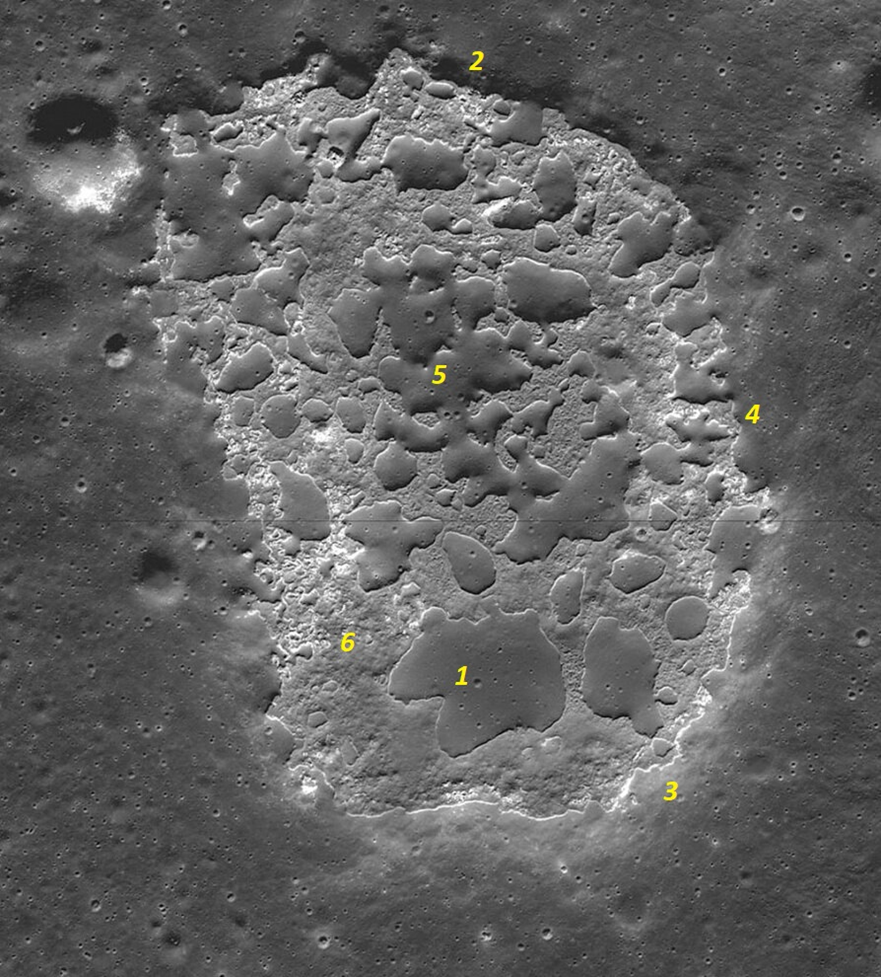 Как часто бывает при рассматривании лунной поверхности, это фото можно видеть двояко. Если неправильно настроить зрение, то кажется, что виден набор из углублений. Однако это набор из возвышенностей. Это части той же жижи, которая заполняла поверхность вокруг. В данном случае жижа имела значительное поверхностное натяжение, о чем говорят скругленные края этой жижи как на каждом отдельном элементе по средине фото, так и на окружающих центральную зону краях застывшей жижи. Очень показательное фото. Поверхность, которая частично залита застывшей жижей не является холмом. Ее уровень ниже, чем уровень поверхности застывшей жижи. Это легко определить по глубинам теней и светлых участков. Поверхность, которая покрыта не полностью застывшими элементами жижи, как бы сопротивлялась растеканию жижи. Как бывает, когда капли воды попадают на ворсистую поверхность зелёного листа растения и капля собирается и не растекается. Особенно важно заметить, что поверхность под застывшей жижей совершенно не и