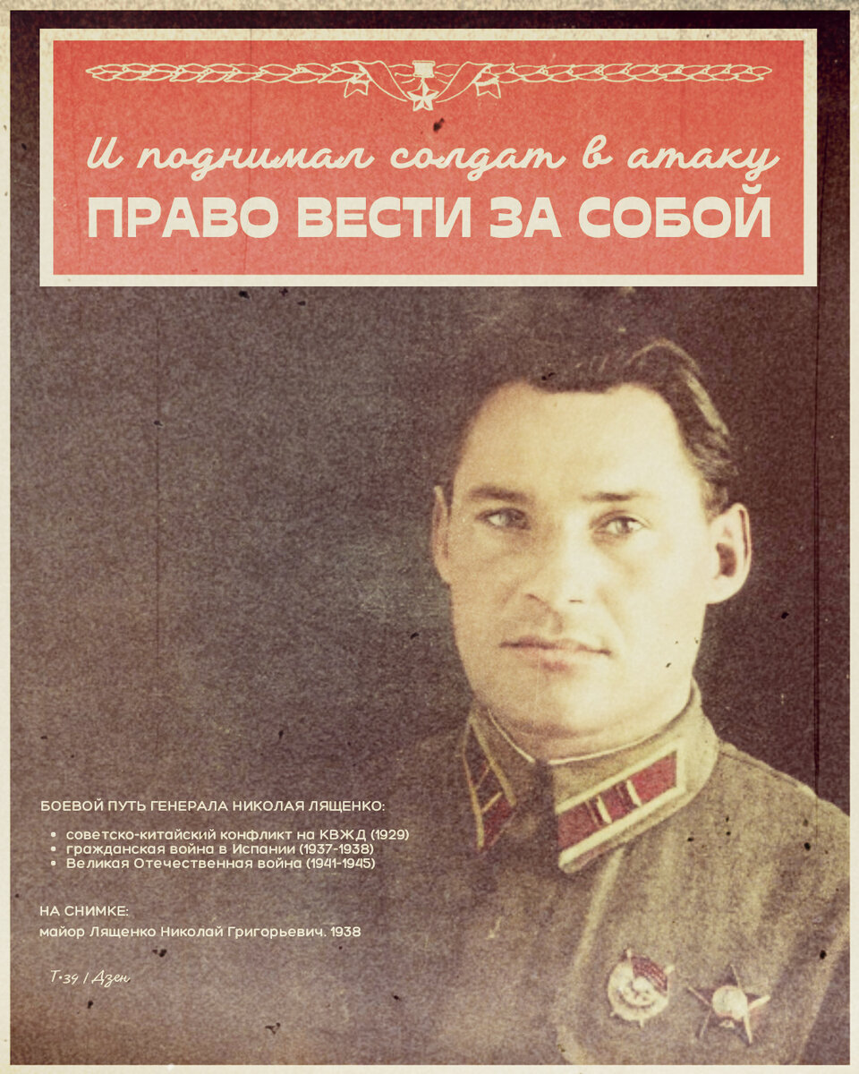 Вот здесь учил солдат рукопашному бою. А здесь был тир. Приехавший как-то с проверкой командующий округом командарм 2-го ранга Михаил Карлович Левандовский долго рассматривал его мишень с изрешеченной «десяткой», попросил повторить стрельбу из нагана. Потом именными часами наградил. Вон там, у казармы, встал в первый раз на лыжи. Как же хохотали бойцы — упал командир, ясно, что с юга, но все равно смешно. Пришлось ночами учиться, в одиночку, всю зиму. Через год стал чемпионом округа в гонке на 50 километров со стрельбой. И перед всем полком поздравляли его, первого в округе мастера спорта, — побил тогда рекорд Вооруженных Сил в стрельбе. А как радовались, когда его взвод привез из Москвы Красное знамя за огневую подготовку! Может, та победа и повлияла на то, что именно ему выпало поехать в Испанию, ведь рапорты многие подали? Спортсмен всегда на виду. Он выделялся на соревнованиях в их полку еще в 1929 году, когда комдив Петров послал добровольца Лященко в Ташкентскую военную школу. (Через пятьдесят с лишним лет после тех коротких встреч с комдивом прочтет генерал армии Лященко книгу Владимира Карпова «Полководец» о генерале армии Петрове).