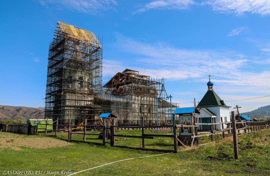 Простой русский храм, как где-нибудь под Ярославлем - но только среди сопок, тайги, быстрых рек, глубоких руд и таинственных бурханов. И правда, удивительное место, которое обязательно к посещению, если вы окажетесь рядом. Очень здорово, что данная церковь станет, как новой уже довольно скоро.