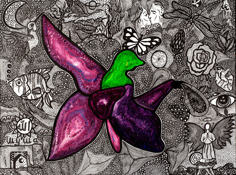 Он взревел с утроенной силой и все же согнул розу пополам, почти сломал. В этот момент к ней подлетел соловей и заслонил собой от ветра. Ветер задул сильнее, и сердце соловья проткнул шип. Соловей погиб, но защитил свою любовь. Если присмотреться, сложные очертания цветка действительно напоминают эту сцену: опустившая голову роза и гордая птица, в отчаянном жесте расправившая крылья.