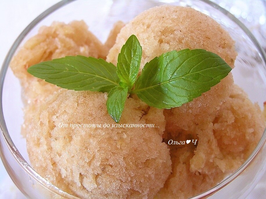 веточки мяты для украшения Приготовление: Все ингредиенты выложите в чашу блендера. Взбейте пару минут до однородности. Выложите пюре в контейнер и поставьте в морозилку. Каждые 30-40 минут тщательно перемешивайте. Через 5-6 часов десерт будет готов. Перед подачей разложите сорбе по креманкам, украсьте веточкой мяты. Приятного аппетита!