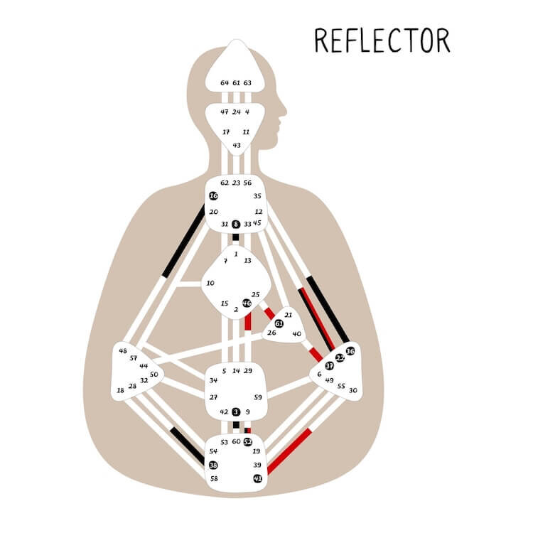 Рефлектору нужно обучиться тому, что этот мир состоит из всевозможных видов сил и людей. Ему нужно научиться тому, что в мире не существует плохого и хорошего, а лишь различные перспективы и энергии. При этом ему необходимо убежище, в котором он всегда может очиститься от обусловленностей, которые постоянно набирает. В карте Рефлектора все центры открыты, поэтому он постоянно обуславливается от других людей.