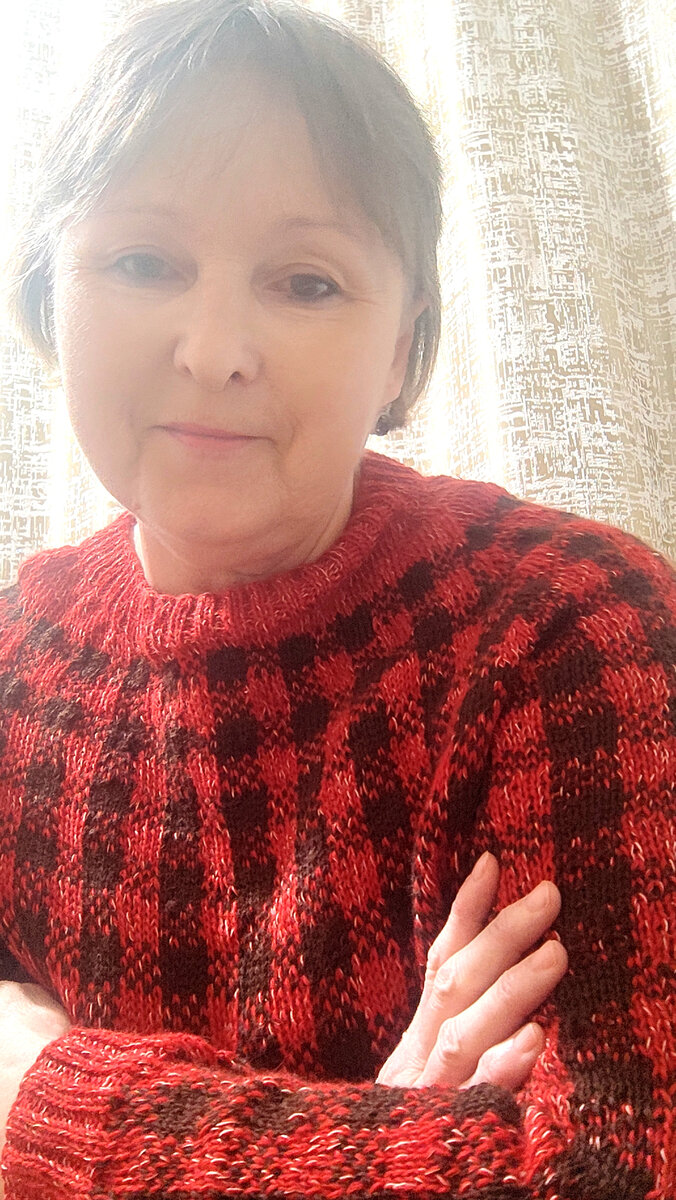 Пускай задуманное, у каждого сбудется! Около года назад очень захотелось связать джемпер в стиле "Шотландка", ( простой жаккард в клеточку ) и пряжу вроде купила подходящую, и вот наконец свершилось! Даю краткое описание: ( правда есть ещё и видеообзор см. по ссылке https://dzen.ru/video/watch/646f99fab731193dc9c777bf ) и так, вес изделия 360 гр. Горловина и манжеты, низ изделия резинка 2х2 Жаккард узор "Шотландка" Нулевой реглан. Образец: 26 петли - 10 см 28 рядов - 10 см пряжа бобинная 2500м/100 гр в 4 сложения, цвет коричневый ( кофе с молоком, и темно-красный + одна нитка х.б ) спицы: Спицы №3,5 (основные детали) и № 3 (горловина, манжеты, низ изделия) Расчет петель. Набрала 152 петли на спицы №3 и провязала 12 рядов резинкой 2х2 по кругу. Петли для вязания реглана разделить на такие части по 71 петле - передняя часть и спинка и рукава по 1 петле и 4 регланных линии по 2 петли. После обработки горловины перейти на спицы №3,5 и начиная с первого ряда вязания ростка делат
