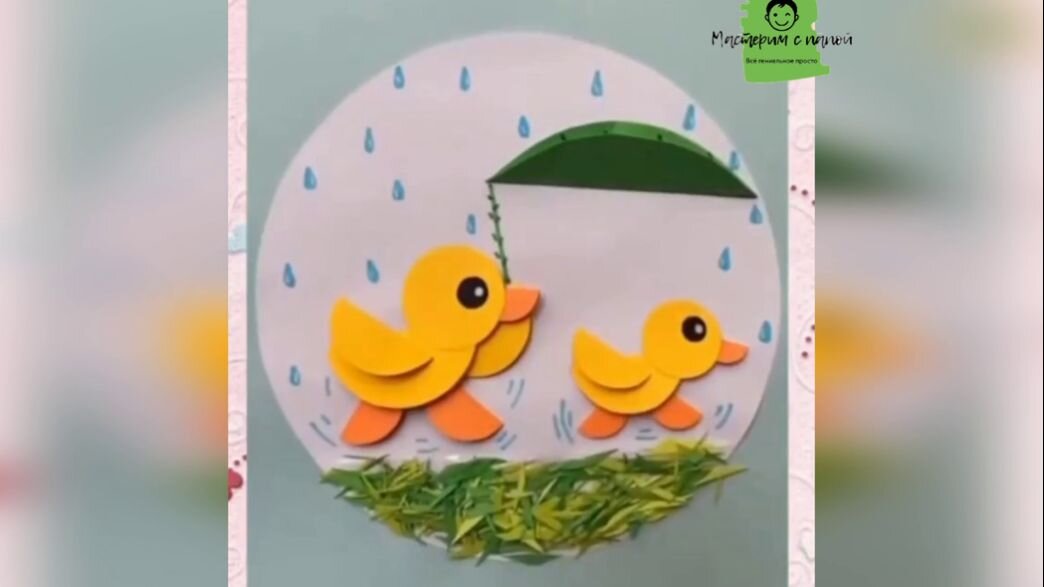 для этого нам нужно: Первое что нам нужно сделать это выбрать цвет подложки, вырезаем круг белого цвета и наклеиваем его на подложку. После чего наносим клей на нижнюю часть круга там у нас будет трава. для изготовления травы используем мелко нарезанную цветную бумагу зеленого цвета. после этого начинаем готовить заготовки для уточек. Вырезаем небольшие кружочки желтого цвета в количестве трех штук, два мы сгибаем пополам. после чего делаем еще 3 сложенных пополам оранжевых кружочков меньшего диаметра. все приклеиваем дорисовываем глазик, и приступаем у изготовлению маленькой уточки по тому же принципу. Из зеленой бумаги делаем небольшой овал и так же сгибаем пополам. У нас получился лист - зонтик. По итогу дорисовываем капли и брызги воды и наслаждаемся результатом. Спасибо за внимание! ниже имеется видео инструкция)