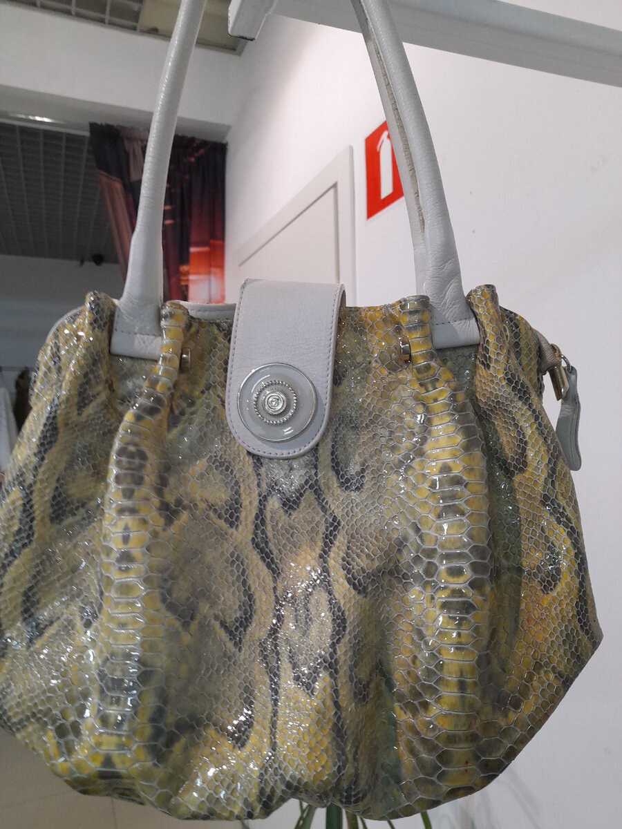 Традиционно на новом завозе в субботу сразу же иду к сумкам. Ну люблю я посмотреть на хорошие сумки как на произведение искусства, а также изредка купить для себя что-то необычное. Хотя, как уже не раз писала, завозы сумок в Зигзаге Удачи в последнее время оставляют желать лучшего. Обратила в этот раз внимание на качество и цены... Но все по порядку. Кожаная сумка, имитирующая кожу змеи: Очень хорошая имитация, но все-таки вряд ли это натуральная кожа - рисунок повторяется, да и полотно цельное не сшитое и слишком большое. Хотя, возможно, я чего-то не знаю, я не специалист по коже из рептилий. Изучать времени не было. Тем не менее, по качеству кожи понятно, что сумка изначально стоила не дешево. Стоила, кажется, всего 1500 руб. Еще одна кожаная, но без бренда: Красивые цвет, отделка. Но уже имеет потертости, поэтому была оценена в 750 руб.: Еще одна белая кожаная сумка без бренда: Примечательна красивой подкладкой с рисунком пейсли: Была оценена в 1000 руб. Честно говоря, цены в этот