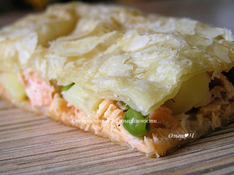 соль, перец по вкусу Приготовление: Разморозьте слоеное тесто. Форель отварите 10 минут в подсоленной воде, затем разберите на маленькие кусочки. Тесто немного раскатайте, разрежьте на 2 части. На одну часть выложите рыбу, зеленый горошек, измельченный чеснок и нарезанную кубиками картошку, оставив с краев по 2-3 см теста без начинки. Посолите, поперчите. Накройте второй половиной теста, залепите края. Переложите пирог на противень, выпекайте при 230*С около 20 минут до румяности. Остудите пирог, нарежьте на порционные кусочки и подавайте. Приятного аппетита! Вам также могут понравиться: