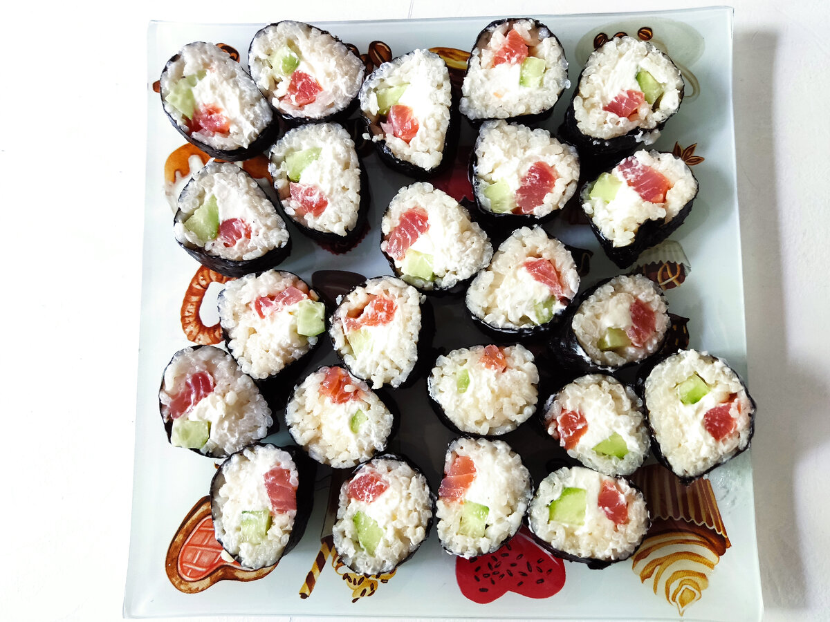Здравствуйте ☺ Периодически у меня возникает острое желание отведать роллы. Когда у меня нет возможности их заказать, либо я одна дома, делаю себе небольшую порцию домашних ролл. Я не готовлю роллы в больших количествах, не хочу возиться. Если хочу разнообразные начинки, то проще их заказать, чем упасть на плиту. А для небольшого количества нам понадобится: - листы нори - рис круглозернённый 300 гр. - 1 ч. л. рисового (яблочного) уксуса - 2 ч. л. соевого соуса - 0.5 ч. л. соли - 1 ч. л. сахара Отвариваем рис без добавления соли. На сильном огне доводим до кипения, ставим на медленный огонь до готовности. Для заправки риса перемешиваю в маленькой емкости уксус, соевый соус, соль и сахар. Если крупицы соли и сахара не растворились до конца, следует немножко подогреть на плите или микроволновке. Для начинки использую: - слабосолёную красную рыбу - огурец - сливочный или творожный сыр Распределяем рис на листы нори, оставляя немного места. Выкладываем начинку немного отступая от к
