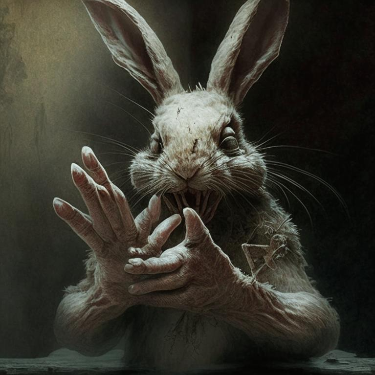 Жила-была одна девушка по имени Кейтлин. У нее был прекрасный белый кролик по кличке Билли. Она очень любила своего кролика и ухаживала за ним каждый день. Но однажды что-то странное начало происходить с Билли. Она заметила, что ее кролик стал откусывать ей пальцы. Сначала она думала, что это случайность, но потом обнаружила, что это происходит все чаще и чаще. Кейтлин испугалась и решила провести ночь в другой комнате. На следующее утро Кейтлин проснулась с жуткой болью в правой руке. Она подняла глаза и увидела своего кролика, который уже начал откусывать ей пальцы. Крича от боли, она смогла выбросить кролика из комнаты и вызвать скорую помощь. Когда врачи приехали, они увидели, что кролик продолжал атаковать Кейтлин и уже успел откусить ей несколько пальцев. Они сумели вытащить Билли из комнаты и доставить его в ветеринарную клинику для животных. По мере того, как Кейтлин выздоравливала, она все еще испытывала кошмары о своем кролике. Но через несколько недель она получила звонок из