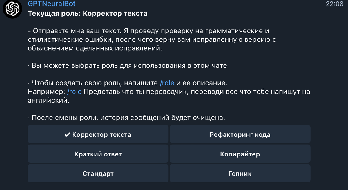 Вы можете выбрать нужную вам роль. Так, например, бот поможет вам проверить ваш текст на любые ошибки, как стилистические, так и грамматические Вы также можете задать вопрос или задачу любой сложности. Бот в любом случае поможет вам с ответом. Например, если вы маркетолог и вам нужно придумать слоган для нового продукта: Представим ситуацию, если вам необходим корректный перевод с русского на английский или наоборот. В таком случае, сделать это без ошибок вам поможет бот: