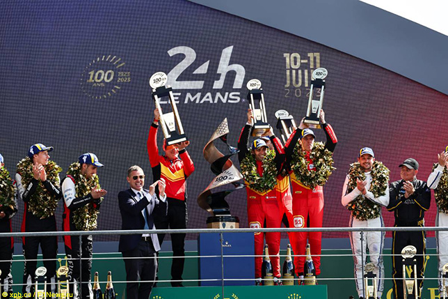 Сегодня на высшую ступень подиума в Ле-Мане поднялись гонщики Ferrari AF Corse Алессандро Пьер Гвиди, Джеймс Каладо и Антонио Джовинацци, победители труднейшего 24-часового марафона, который в этом году отпраздновал 100-летие, но проводился в 91-й раз. Награды экипажу гиперкара Ferrari 499P с номером 51 вручал Том Кристенсен, который в своё время сам поднимался на этот подиум рекордные девять раз, за что заслужил престижное прозвище «Мистер Ле-Ман». В предыдущий раз заводская команда из Маранелло побеждала в самом престижном классе на этой трассе 58 лет назад. На второй ступени подиума стояли гонщики Toyota Себастьен Буэми, Брендон Хартли и Рио Хиракава, что, конечно, не доставляло им особой радости, ведь они привыкли к победам. Швейцарец вместе с напарниками по заводской команде японского концерна четыре раза выигрывал «24 часа Ле-Мана», Хартли – трижды, причём в 2017-м ещё вместе с Porsche. На протяжении почти всей гонки, несмотря на все приключения, экипаж Toyota №8 сохранял шансы н