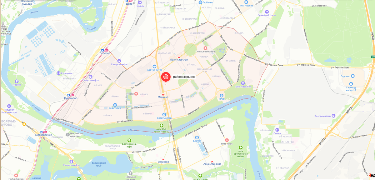 1. Марьино - исторически один из самых недорогих районов Москвы. Район находится на юго-востоке Москвы, имеет сложившуюся инфраструктуру, много прогулочных зон в шаговой доступности.