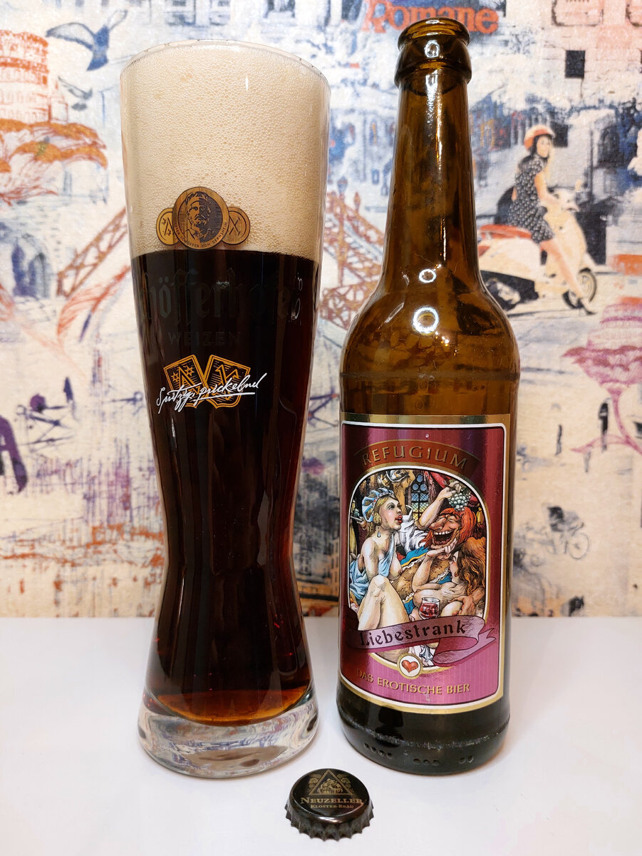 Тот случай, когда покупаешь пиво, потому что этикетка "забавная". Производитель: "Klosterbrauerei Neuzelle GmbH". Германия. Почему-то на сайте пивоварни именно этого сорта не нашёл и пришлось обратиться к UNTAPPD. Но и там никакой информации. Так что... Ограничимся тем, что название пива переводится как "Приворотное зелье". А надпись у нижнего края этикетки гласит: "Эротическое пиво". Плотность: 14%. Состав: вода солод ячменный, хмель, инвертный сахарный сироп. "Инвертный сахарный сироп, также называемый инвертным сиропом и инвертным сахаром, представляет собой съедобную смесь двух простых сахаров—глюкозы и фруктозы—которая получается путем нагревания сахарозы (столового сахара) с водой. Считается, что он слаще столового сахара, а продукты, содержащие инверт, лучше сохраняют влагу и легче кристаллизуются, чем те, которые используют вместо него столовый сахар." Пена пышная средней стойкости. В аромате лёгкая хлебная жжёнка с карамелькой и едва уловимым кофе. Вполне плотное для тёмного