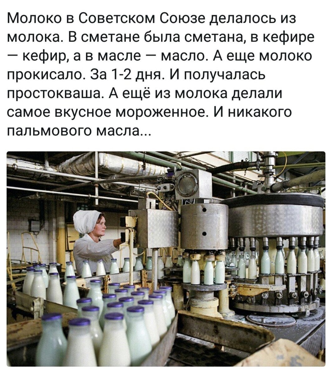 Молоко в СССР делалось от коровы, которых в колхозах и совхозах было много как и в частных подворьях. А сейчас из деревни в город едут в магазины и покупают молоко и мясо. И я повторюсь ,были колхозы и совхозы,людям давали зерно,сено,солому И так далее.И скотина была в каждом дворе. В СССР были ГОСТы, которые неукоснительно соблюдались, а сейчас капитализм и выгода превыше всего, а не здоровье обобранного и обварованного народа. Кто-то скажет,что хранится год пастеризиванное в герметичной упаковке молоко . А обычное через неделю прокиснет. А вот и не киснет оно. Превращается в какую то горькую гадость . Оно не киснет, а тухнет. Кто не пил натурального, не может знать того вкуса. Помните в сливках, в пакетах, появлялось маслице, был приятный аромат. Домашние коровы то же давали молоко разной жирности, от одной у нас в банке уже на третий день на два пальца сливок было, а от другой нет. Сегодня и коров, тех немногих, что есть, кормят химией. Качество продуктов в Союзе было на порядок л