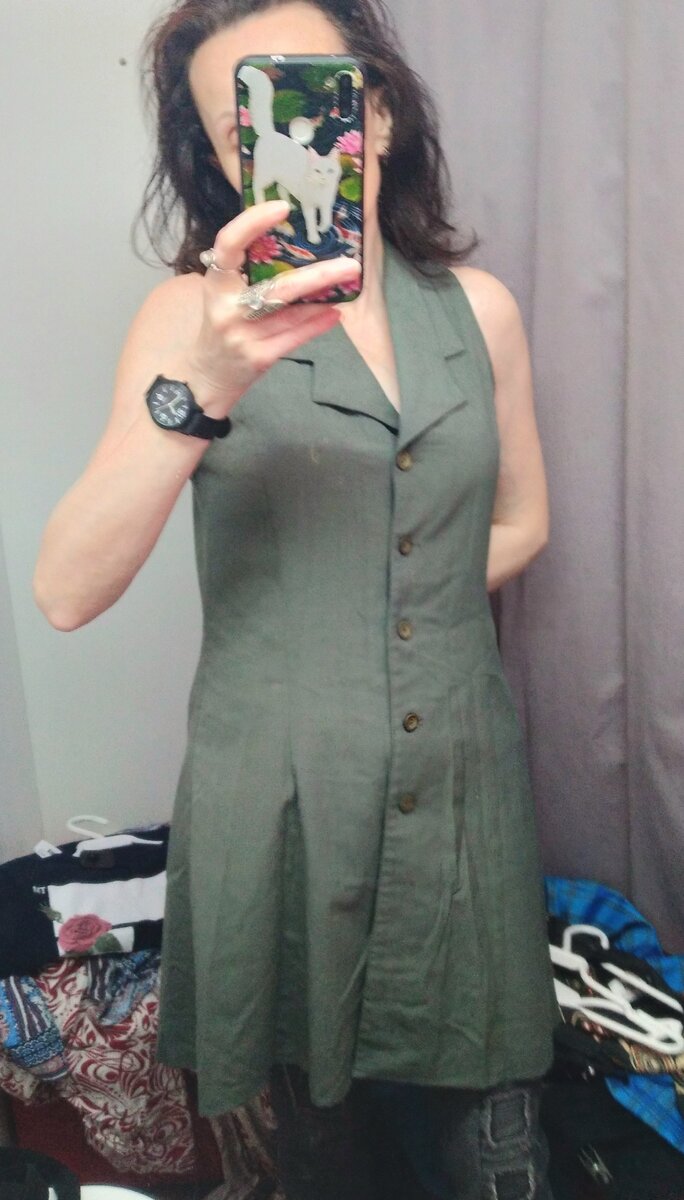 Здравствуйте. Я глазастая (вдаль я хорошо вижу )) и любопытная, иду и головой верчу, надо всё разглядеть. И повезло ведь! Разглядела! На дворе лето, а стоит на балконе у людей новогодняя ёлочка в игрушках. Без наконечника и мишуры, но в шариках. Небольшая ёлочка, но повыше меня точно. Это же какие люди молодцы, пока мы будем корячится и доставать с антресоли ёлку, потом распутывать гирлянды, которые я каждый раз так аккуратно складываю сразу по снятию(((. Потом начинается битва с кошками за мишуру, это столько возни, а умные люди перетащат ёлку с балкона в комнату и отдыхают. Соображалка у людей работает!!! Обзор из Столичного гардероба, всё можно было купить со скидкой 80%. Для меня это короткое платье, кому-то туника. Не очень оптимистичный серо-зеленый цвет. Глубокие складки во швах и что-то похожее на американскую пройму. Американская идет прямо от шеи, эта тоже скошена, но намного меньше. Полная цена 800 рублей. В последнее время мне везёт на бренд K-Desing. Почему-то чаще всего
