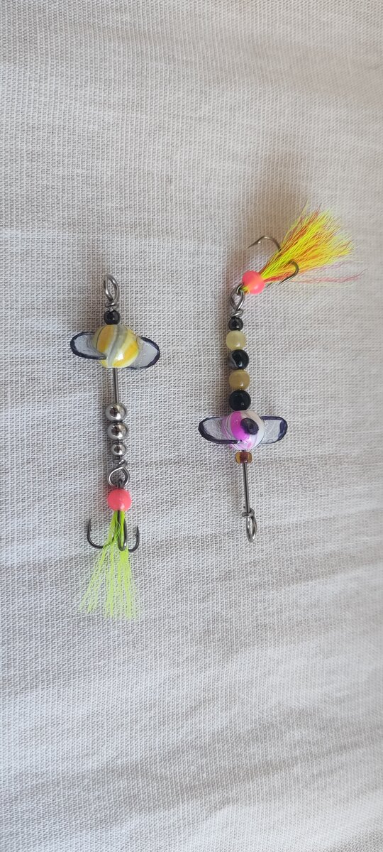 Доброго времени суток, друзья! Арсенал вертушек пополнил и до кучи решил сделать ещё мелкие турбинки. Приманка простая, интересная. Имитирует летающих насекомых и уверен что в жаркие летние дни обязательно покажет себя с наилучшей стороны. Я на изготовление потратил не больше получаса. Для изготовления самой турбинки нужна пластиковая бусина, пэт бутылка, пилка по металлу и суперклей. Делаем пропилы под углом от центра оси. Я делал 2 напротив друг друга по 45°. Можно заморочиться и сделать три, но я не стал запариваться))) вырезаем из пэт бутылки полукруглые лопасти и вклеиваем их в бусину на суперклей. Как высохнет клей, ножницами и надфилем выравниваем лопасти и турбина готова. Тройник с опушкой можно изготовить практически на коленке. Берём шерстинки, нитки или что есть под рукой, складываем пополам и просовываем в ушко крючка, прижимаем, капелька супер клея и быстро поверх фиксируем кембриком, я в данном случае зафиксировал силиконовой бусиной. Как подсохнет пару минут, ножни