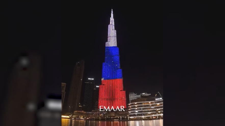 Самое высокое здание в мире - башню Бурж-Халифа в Дубае окрасили в цвета российского флага в честь дня России